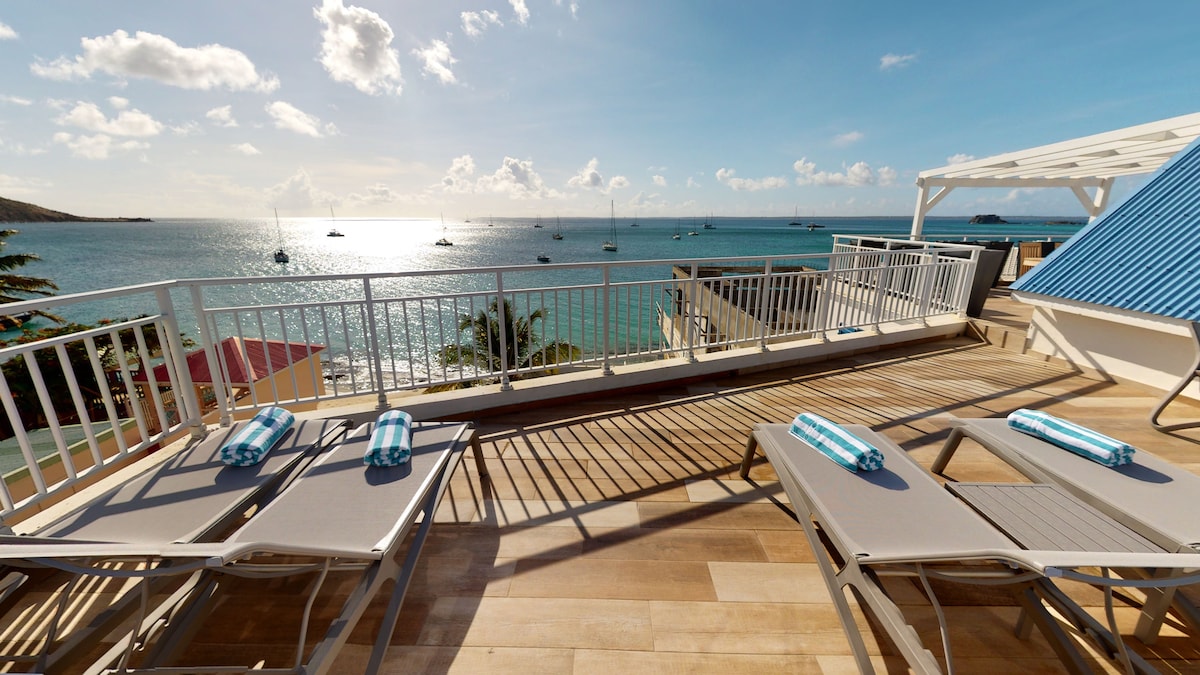 Un loft excepcional frente a la playa en Grand Case Beach, que ofrece majestuosas vistas al mar y una ubicación privilegiada sobre el icónico Rainbow Café. En temporada alta, un ambiente elegante y moderno marca la pauta hasta alrededor de las 11 p.m. Las tumbonas se pueden reservar directamente o a través de nosotros, pero los huéspedes que reserven con nuestra ayuda disfrutarán de toques privilegiados. Un refugio luminoso y sofisticado a solo unos pasos de los mejores lugares de Grand Case.