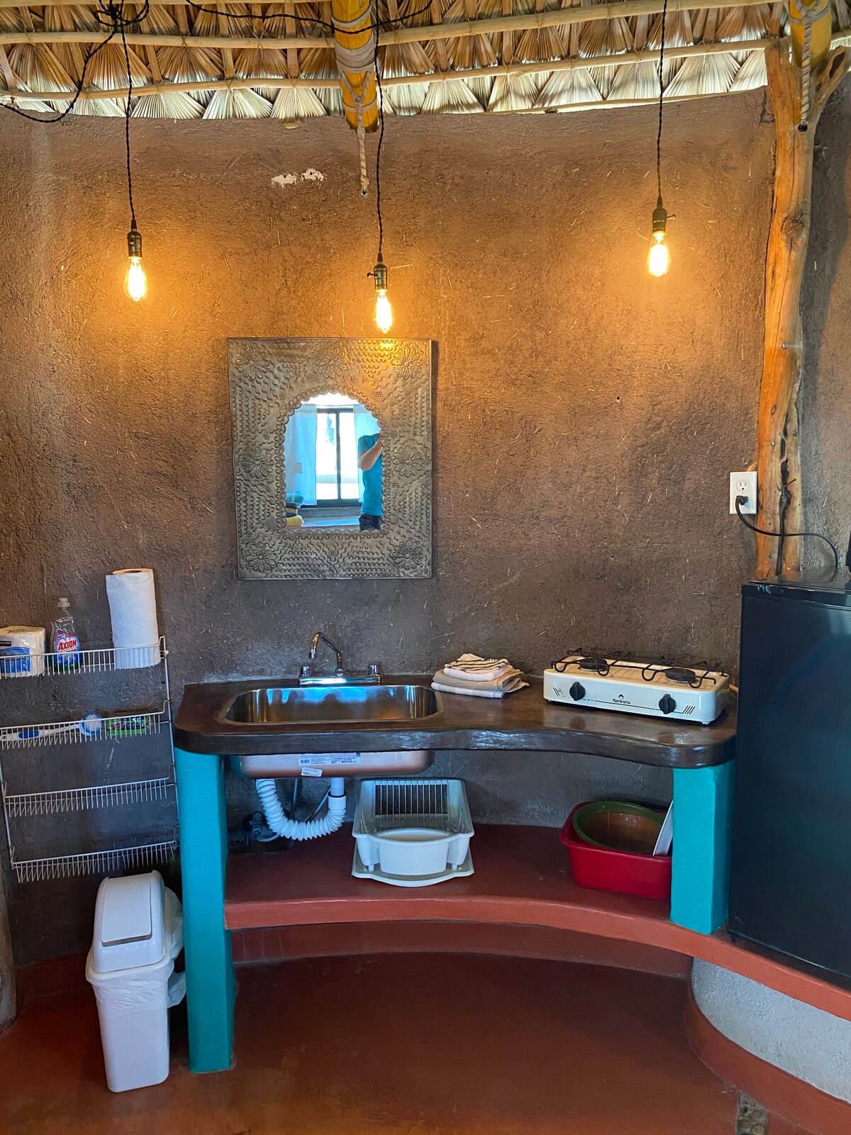 Pequeño estudio fuera de la red, con energía solar y techo de paja, cuenta con Internet Starlink, cama tamaño queen, cocina pequeña, baño, hamaca y patio sombreado con palapa. El estacionamiento gratuito está a 2 cuadras de la casa. Se proporcionan sillas de playa, sombrilla, toallas y nevera. Tiendas de buceo, playa para nadar y restaurantes a 5 minutos a pie. El Surf Hut y el Pelican Palace se encuentran en el mismo lote, pero tienen acceso independiente. Unidad no preparada para niños menores de 10 años.