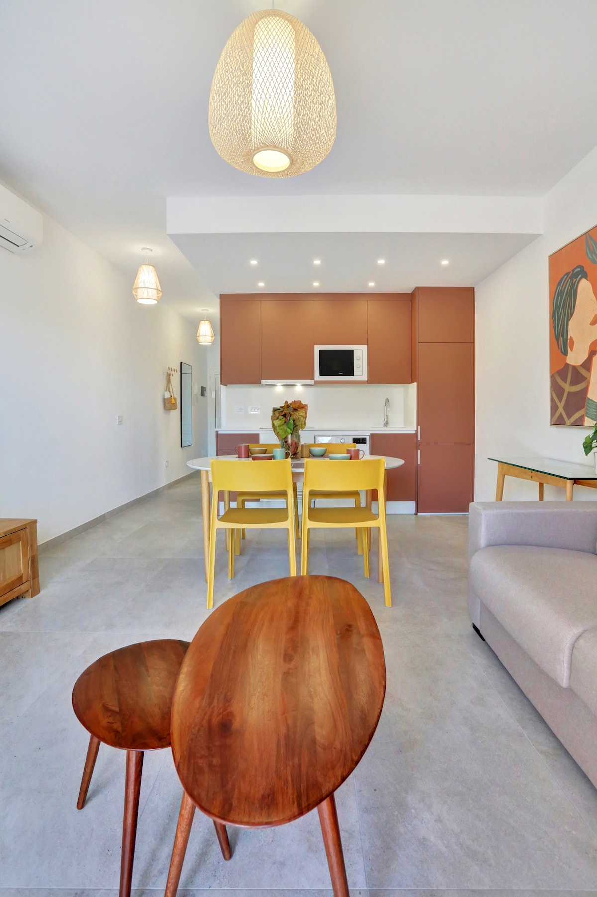 Este encantador apartamento moderno está cuidadosamente renovado para ofrecer el mejor ocio y relajación. Cuenta con una cocina abierta totalmente equipada con un amplio comedor luminoso y una sala de estar luminosos, que conduce a la gran terraza y vistas al jardín. El apartamento tiene un dormitorio cómodo con armario empotrado y un moderno baño con ducha. El complejo ofrece una piscina comunitaria exclusiva para los residentes y una variedad de excelentes restaurantes. La playa está a solo 10 minutos a pie.