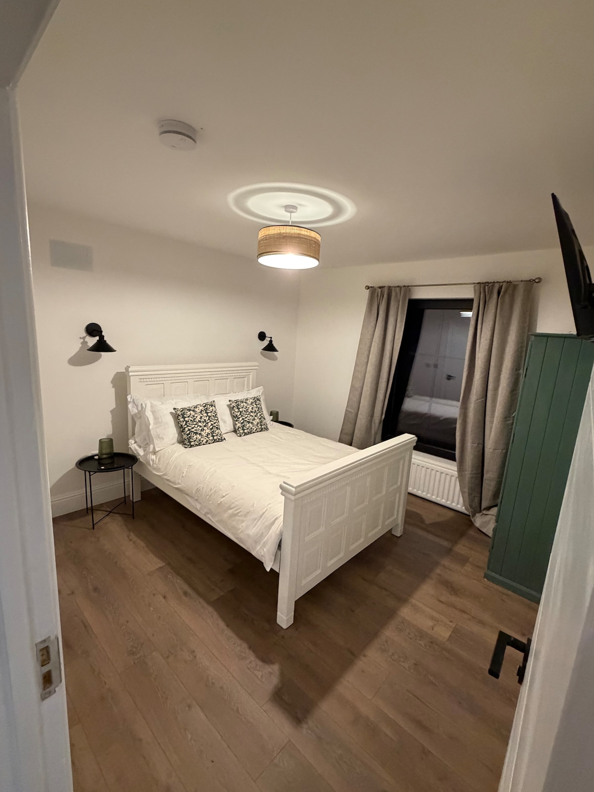 Disfruta de la comodidad en nuestro dormitorio del primer piso en nuestra casa, Seamount Lodge, con vistas al mar (a lo lejos). Esta acogedora habitación cuenta con una cómoda cama tamaño king (6'3'' L x4'7” W), un elegante baño en suite y un ambiente acogedor que la hace perfecta para la relajación. Con una iluminación suave y una decoración de buen gusto, es un refugio ideal después de un día explorando el rico patrimonio del valle de Boyne. La habitación está equipada con un hervidor de agua y té y café.