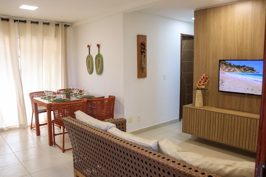 Cómodo apartamento con cocina, baño y dos dormitorios, ambos con smart TV y aire acondicionado, bien equipado, en cond. nuevo, situado a unos 500/600 m del centro de Pipa y cerca de las playas paradisíacas de la región. El condominio dispone de aparcamiento gratuito (1 plaza por apartamento), recepción 24 horas, piscina infantil y de adultos y otra de hidromasaje, quiosco/bistró y un pequeño y relajante bosque. El apartamento tiene vistas a la piscina y al jardín, ducha de agua caliente y wifi de alta velocidad.
