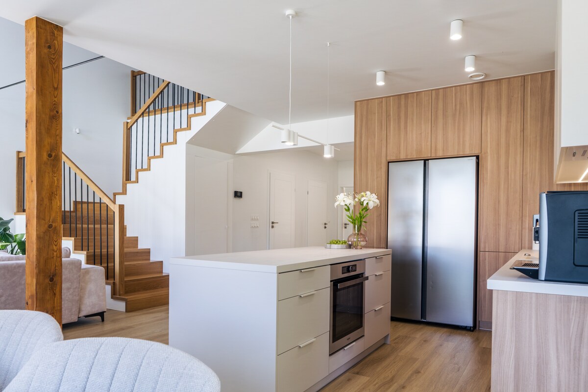 La segunda cabaña es de hace mucho tiempo, de piedra. Lo llamamos AleL Luxury porque cuando estábamos trabajando en la renovación, resultó ser solo materiales nobles para la piedra vieja. Hicimos mesas de madera de roble. Hermosas puertas de la cocina estallan fuera de tiempo. El fregadero está hecho de piedra de la orilla del río y el fregadero está hecho de materiales de granito. Una cereza en el pastel es una sauna inflable hecha de azul.
