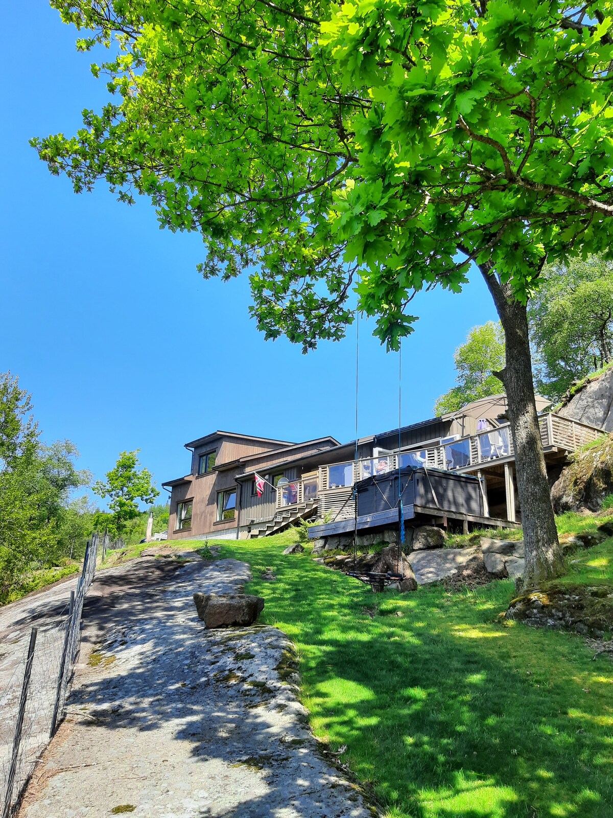La cabaña tiene una hermosa vista de todo el fiordo Jøssing. Es una gran zona de senderismo alrededor,con Brufjellhapsene y Trollpikken cerca. El viaje a Kolbolten y Nesvåghål también debe ser experimentado, donde la edad de hielo ha creado un paisaje cultural muy especial. Sogndalsstrand está a 10 minutos, con pequeñas tiendas de nicho, restaurantes y cafés. Debajo del estante de montaña en la parte inferior del fiordo, hay dos pequeñas casas, "Helleren", que se deben visitar. Hay oportunidades para nadar y pescar. La cabaña tiene un gran patio con dos terrazas.