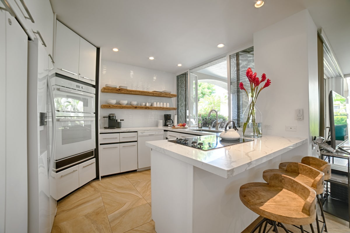 Apartamento completamente renovado con cocina y baños actualizados en la planta baja con lanai. Esta unidad de esquina es tranquila con cinturones verdes circundantes. Las comodidades incluyen aire acondicionado y lavandería. Cocina totalmente equipada con electrodomésticos de tamaño completo. Persianas electrónicas Lutron en todas partes. 2 televisores grandes y wifi rápido. Ten en cuenta que hay una tarifa de procesamiento de pagos que cobra la tarjeta de crédito del 3,23 % para VRBO (no para Airbnb). Se enviará un contrato de alquiler por correo electrónico después de la reserva.
