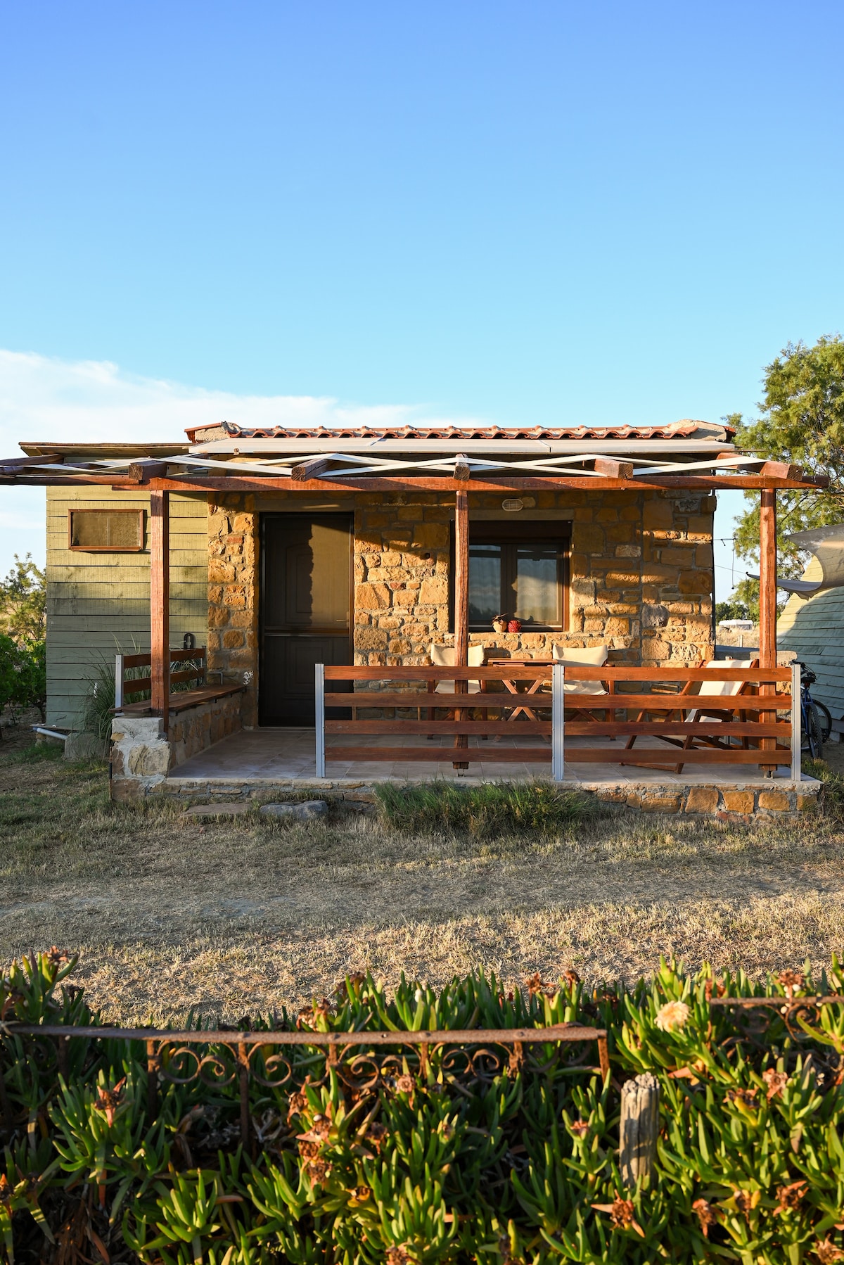 Welcome to the eco friendly bungalow that is located in Keros beach. It is a stone house of 20sqm with terrace from which you can see the bay and enjoy the beautiful sunset. It has a small bathroom with a shower and also a kitchenette.The bungalow operates only with renewable energy sources.