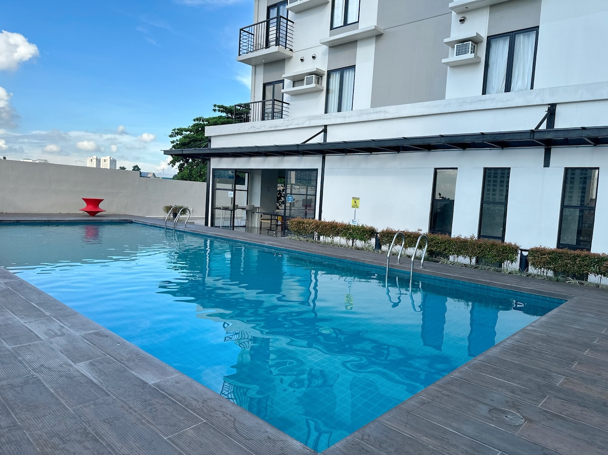 Alójate en este acogedor condominio de 1 dormitorio con balcón cerca del aeropuerto de Cebú, las playas y los centros vacacionales de Mactan. Perfecto para parejas o un grupo pequeño (hasta 4), este moderno refugio ofrece: - Cama tamaño queen + sofá cama cómodo. - Wifi rápido y TV lista para Netflix. - Cocina y comedor totalmente equipados - Aire acondicionado refrescante. Te esperan comodidades de estilo resort: nada en piscinas resplandecientes, mantente activo en el gimnasio o disfruta de la sala de juegos. Ya sea que estés aquí para relajarte, explorar o trabajar de forma remota, este condominio es tu hogar perfecto en el paraíso.