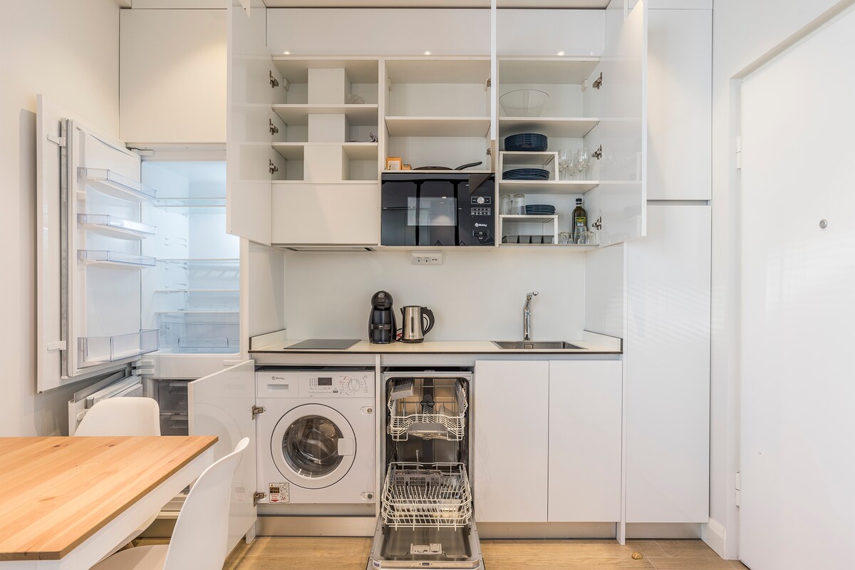 Estudio exterior para 2 personas en un aparthotel moderno con 24 unidades, cada una con baño y cocina integrada. El estudio incluye Wi-Fi, secador de pelo, bomba de calor, aire acondicionado y TV. La cocina abierta cuenta con placa de inducción, nevera, microondas, congelador, vajilla, cafetera y hervidor. Los huéspedes pueden usar la lavandería compartida con lavadoras y secadoras dentro del aparthotel.