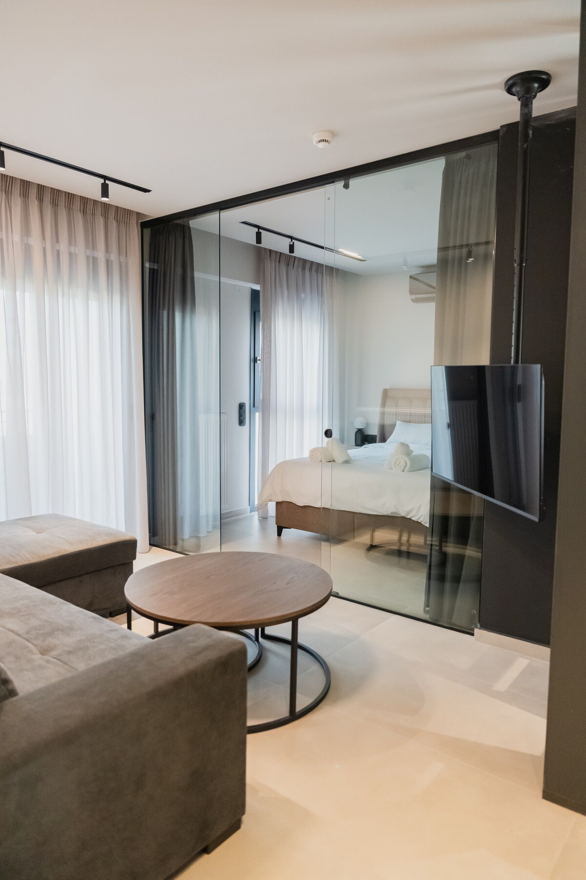 Disfruta de una experiencia elegante en nuestro nuevo espacio minimalista situado en el centro, frente a la calle Ermou, donde se encuentran todos los centros comerciales y restaurantes del mercado, y a solo una manzana, a 100 metros del mar. La unidad también está a poca distancia a pie de la estación de tren y autobuses.
