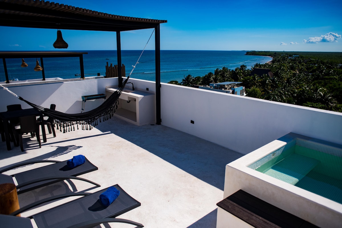 Habitación luminosa y acogedora, perfecta para una escapada junto al mar. A solo unos pasos de la playa, ofrece una vista espectacular al océano y un balcón privado ideal para disfrutar tu café por la mañana. Equipada con todo lo esencial: A/C, refrigerador, agua caliente, smart TV e internet rápido Starlink. La habitación se encuentra en el cuarto piso y no hay ascensor. No recomendada para personas con problemas de movilidad.
