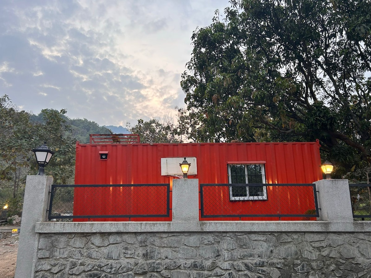 Bienvenido a The Red Container en Captain 's Cottage, un refugio acogedor y de diseño avanzado ubicado en el exuberante corazón verde de Alibaug. Ubicado en una finca privada, es perfecto para parejas, viajeros solitarios o viajeros de fin de semana de Mumbai que buscan una escapada tranquila y elegante. Disfruta de tu chai matutino en la terraza y relájate con el sonido del arroyo adyacente a la terraza.