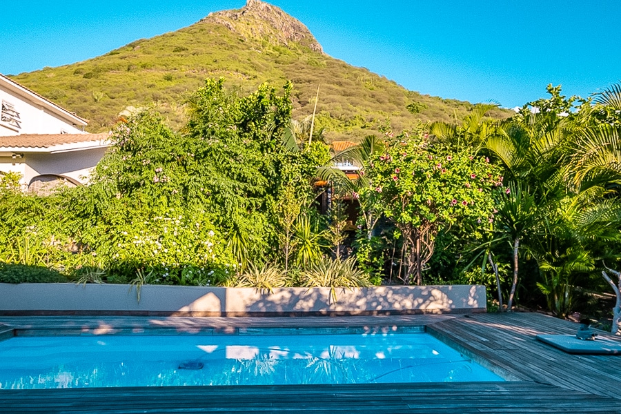 A los pies de la montaña de Morne, vista del campo de golf del Paraíso y la laguna de la isla de Benitiers. A tres minutos en coche de la playa (restaurante, boat house) y a 5 minutos de One Eye (punto de kitesurf). Villa que ofrece tres habitaciones dobles en suite y un dormitorio para 5 niños. La vida se organiza alrededor de la piscina y la varenga (sala de estar, comedor, cocina al aire libre). Una empleada doméstica está incluida en el precio (4 horas al día).
