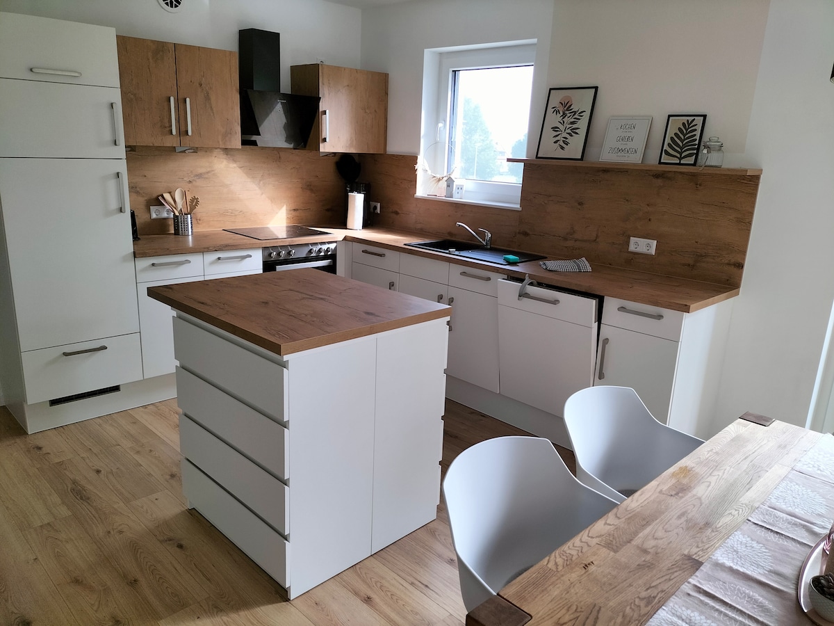 Relájate en pareja o con toda la familia. Disfruta de la tranquilidad de nuestro pequeño pueblo. Llegar, deshacer las maletas, sentirse bien. Y despertarse a la mañana siguiente con el canto de los pájaros. El apartamento con amplia sala de estar es ideal para dos personas o familias pequeñas. Por supuesto, la conexión wifi rápida es gratuita. Hay suficiente espacio para jugar y descubrir. En el patio hay vehículos disponibles, en el jardín se puede descubrir y relajarse. Un coche eléctrico se puede cargar en nuestro Wallbox.