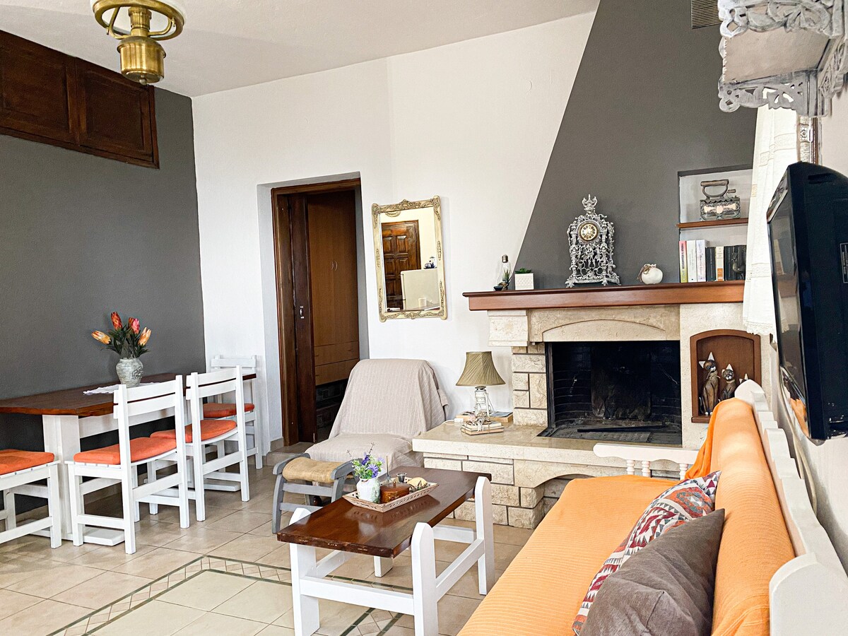 Un apartamento en planta baja de una casa tradicional de dos pisos. Cuenta con su propio patio, con barbacoa y horno de leña, así como excelentes vistas a la montaña y al mar. Tiene una habitación y puede alojar hasta 5 personas. El área al aire libre, el patio, el patio y la barbacoa pueden ser disfrutados por los huéspedes de la planta baja. Los únicos espacios compartidos son el estacionamiento y la lavandería en el cobertizo. La casa está a 5' a pie de la plaza de Kissos y a 15' de las playas de Pelion.