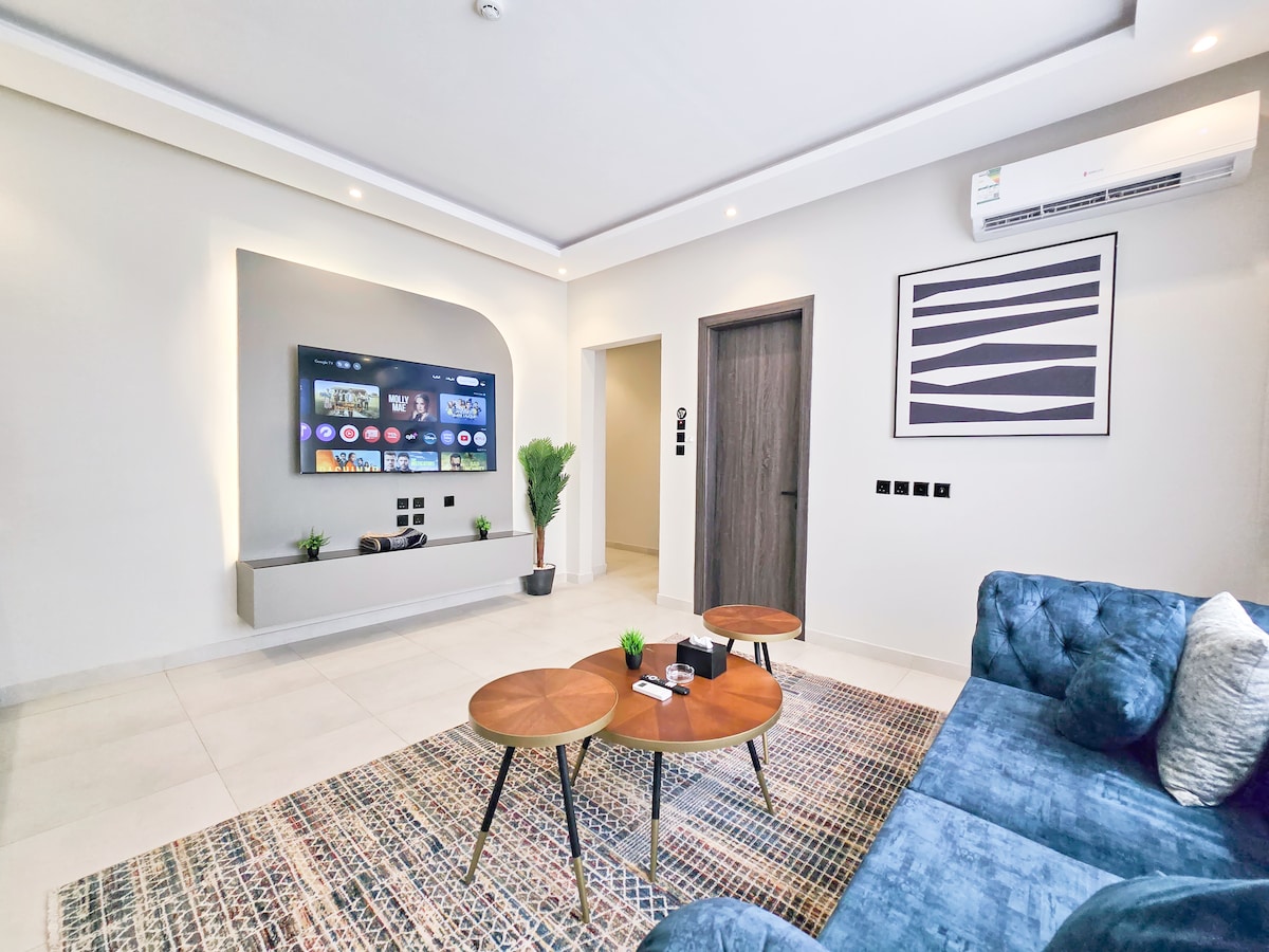 Un apartamento de alta gama en el distrito de Ard, al norte de Riad, con una ubicación estratégica cerca del Aeropuerto Internacional Rey Khalid (aproximadamente 23 km), a solo 8 km del Hospital Al Habib y a 15 minutos del Bulevar. Consta de un dormitorio y un pasillo con un espacio para cocinar y un baño, y está diseñado con muebles elegantes y cómodos, adecuados para estancias cortas o largas. Cuenta con autorregistro para mayor comodidad y accesibilidad, con Internet gratuito y TV inteligente. El departamento está muy limpio, con utensilios completamente nuevos, ubicado en un edificio moderno y completamente nuevo, para garantizar una estadía cómoda y segura para el huésped.