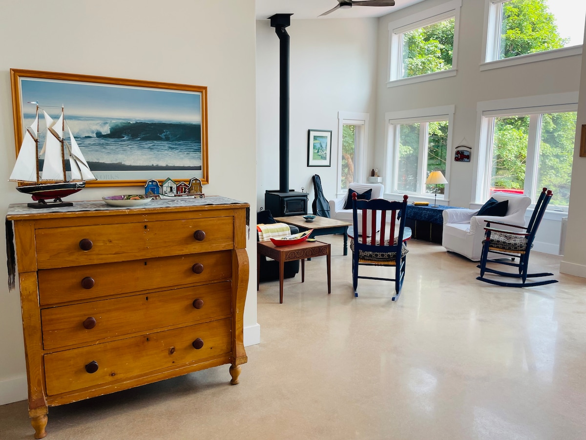 (Licencia n .º2203212) Relájate y rejuvenece en esta moderna cabaña privada frente a la playa de 2 dormitorios y 1 baño al final de la península de Point Prim. Las puertas corredizas de vidrio se abren hacia impresionantes vistas al agua y a la vida silvestre. El acceso directo a la playa privada te permite caminar por la orilla con marea baja, buscar almejas o nadar. A 10 minutos a pie de Point Prim Lighthouse & Chowder House. Disfruta del solárium, la ducha al aire libre, la chimenea, dos bicicletas urbanas y el wifi Starlink rápido. Perfecto para amantes de la naturaleza y escapadas tranquilas.