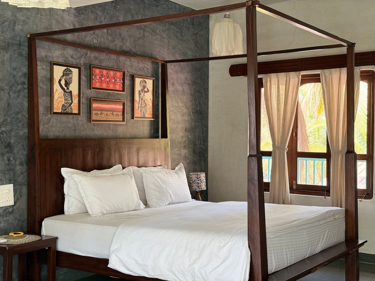 Our Signature Room is a design-forward space featuring a King bed, an open to sky bathroom, and a bathtub blending comfort with thoughtful aesthetics. The room is equipped with high-speed Wi-Fi, air conditioning, and a smart TV for a seamless stay. Located just 1.5 km from the beach and 900 meters from the local market, the property offers easy access while remaining a peaceful retreat. Our spaces are intentionally designed to foster community, creativity, and authentic travel experiences.
