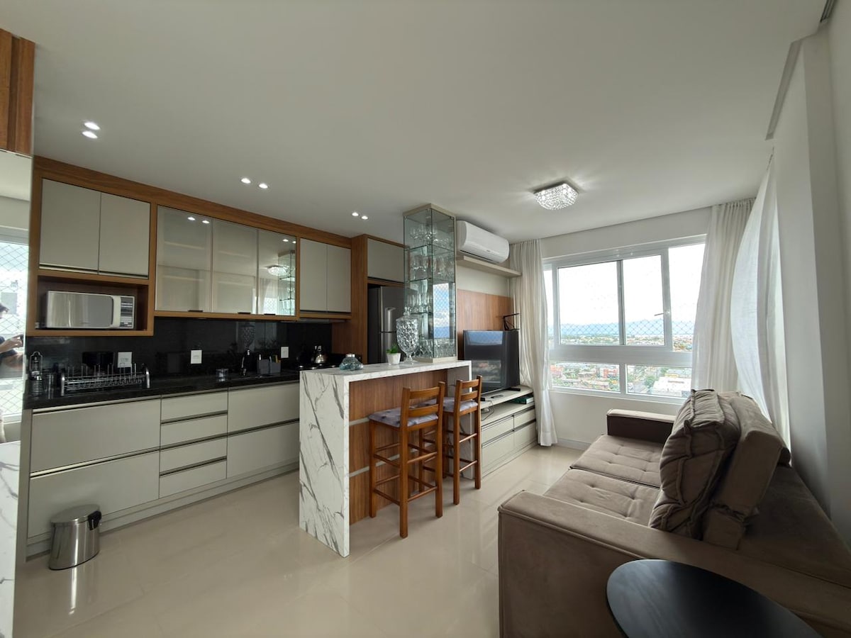 Excelente apartamento en condominio, con infraestructura completa (piscina normal y climatizada, gimnasio compartido, sauna seca y húmeda, salón de belleza, biblioteca de juguetes, campo de fútbol, cancha de tenis/tenis de playa). Área de ocio con barbacoa externa y seguridad total del condominio. Apartamento 100% completo, todos los aparatos electrónicos nuevos, cervecería, freidora de aire, cafetera, sandwichera , TV. Condomínio tiene un punto de apoyo frente al mar con baño, sillas, ducha y protector - sol