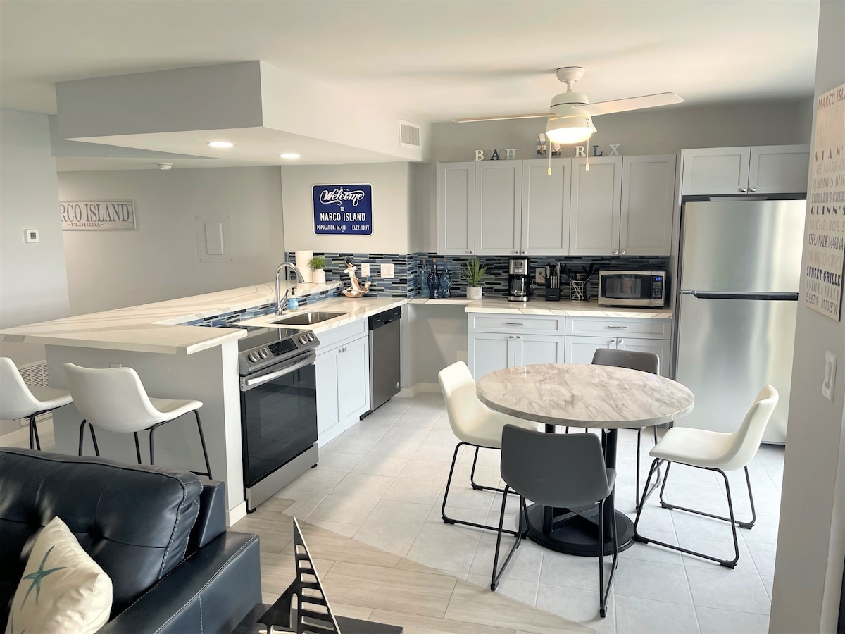 Recientemente reformado en el estilo costero contemporáneo en el río Marco. Azulejos de porcelana tipo tablón de madera en todas partes. Armarios blancos a medida. Electrodomésticos de acero inoxidable. Encimeras de granito. Waterfront Anglers Cove cuenta con dos piscinas climatizadas, jacuzzis, canchas de tenis y el popular Dolphin Tiki Bar and Restaurant de Marco Island. A unos 3 kilómetros de la playa. *Nuevos propietarios a partir del 10/03/22. A partir de esa fecha, el propietario era un Superanfitrión y esta unidad tenía 34 reseñas con una calificación de 5 estrellas. Reseñas disponibles bajo petición.