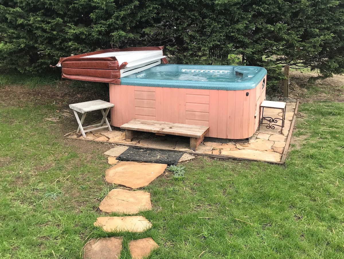 Antigua cabaña de madera de teca indonesia, terraza privada con bañera de hidromasaje y muy especial, grande, artístico cuarto de baño/sala de estar, privado para los huéspedes de la cabaña sólo.. Bellamente rural, sin embargo, a sólo 6 minutos del centro histórico de Petaluma y restaurantes y tiendas finas. Un corto viaje a la costa del Pacífico y al fabuloso Pt. Reyes, Tomales y Bodega y pueblos, excelentes viñedos y cervecerías, ¡y San Francisco! SEGUIMOS LAS PAUTAS DE LIMPIEZA Y DESINFECCIÓN EMITIDAS POR AIRBNB.