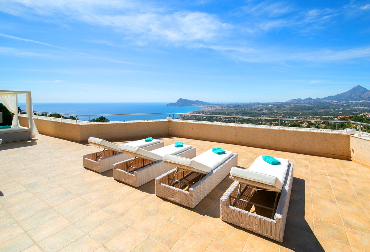 Impresionante apartamento de lujo (235 m2) y gran terraza soleada (165 m2) con vistas panorámicas al mar Mediterráneo, Benidorm y la cordillera Bernia. Ubicado en un complejo muy tranquilo las 24 horas. La casa está totalmente amueblada, equipada con tres dormitorios muy amplios y dos baños, uno de los cuales es en suite con jacuzzi. Se incluye una plaza de aparcamiento privada cubierta. (El apartamento es para no fumadores, no se admiten mascotas y no está disponible para fiestas o eventos).