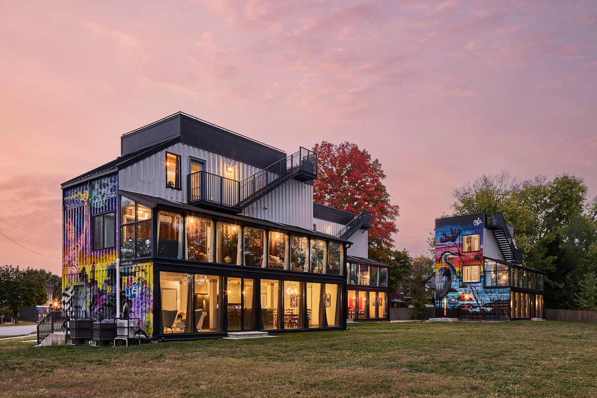 La casa contenedor de cultura pop "The Shadowbox" en el centro de Indianápolis es una de las tres casas contenedor ubicadas en el lote. El alojamiento se compone de 7 contenedores de envío con un invernadero adicional y una terraza en la azotea con vistas al horizonte de la ciudad. Las ventanas del piso al techo en el primer y segundo piso dan a ambos una perspectiva única del río Fall Creek. El alojamiento tiene un gran patio trasero. Un montón de cómics, figuras de acción y juegos para mantenerte entretenido durante tu estancia.