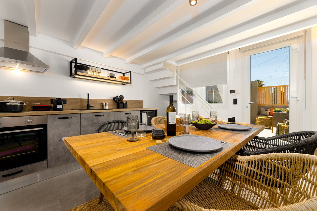 Abre las contraventanas azul marino y deja entrar la brisa refrescante, luego prepara un refrigerio en la encimera de hormigón de la cocina urbana en un refugio frente al mar. ¡Entra en la espaciosa y frondosa terraza para disfrutar de unas tranquilas bebidas al atardecer con vistas panorámicas al mar! El apartamento está situado junto a una playa de arena para nadar por la mañana y a 2 minutos a pie del centro de Naousa y su plaza principal. A pocos pasos hay tiendas, restaurantes, bares y clubes, ¡pero la zona es muy tranquila y silenciosa!