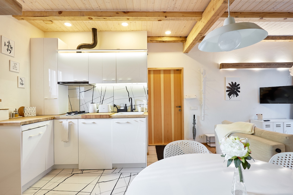 Un refugio para amantes del diseño cerca de Riga. Esta elegante cabaña está junto a nuestro vivero y a pocos pasos de una acogedora cafetería. Rodeado de árboles y flores, es el lugar perfecto para desaparecer por un tiempo. ¡Tenemos batas, pantuflas, cepillos de dientes, toallas, secador de pelo, plancha para el pelo, champú y acondicionador! ¡También ofrecemos gratis una botella de agua, especias, café, té, aceite de oliva, chocolate caliente, etc.! Jacuzzi de leña, €60 por reservación (solicitar con al menos 1 día de anticipación) Para obtener más información: oranzerija.kabriolets