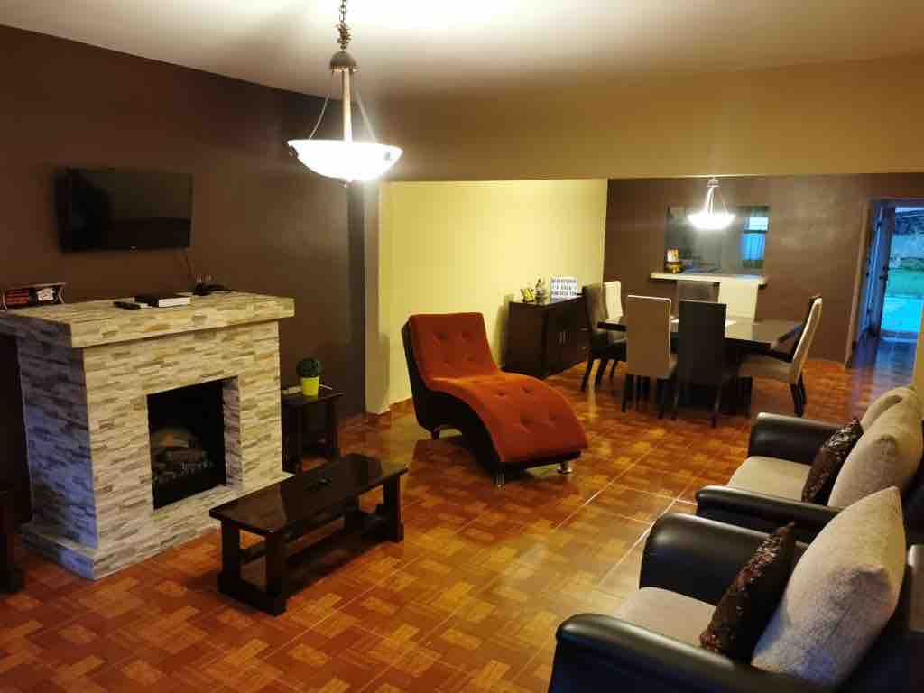 Es una casa de campo tiene dos recamara ,sala con chimenea ,comedor y cocina ,hay un jardín y puedes hacer una caminata en la naturaleza en el jardín hay un asador con un techo de lámina, la casa cuenta con agua caliente y fría ,tv .