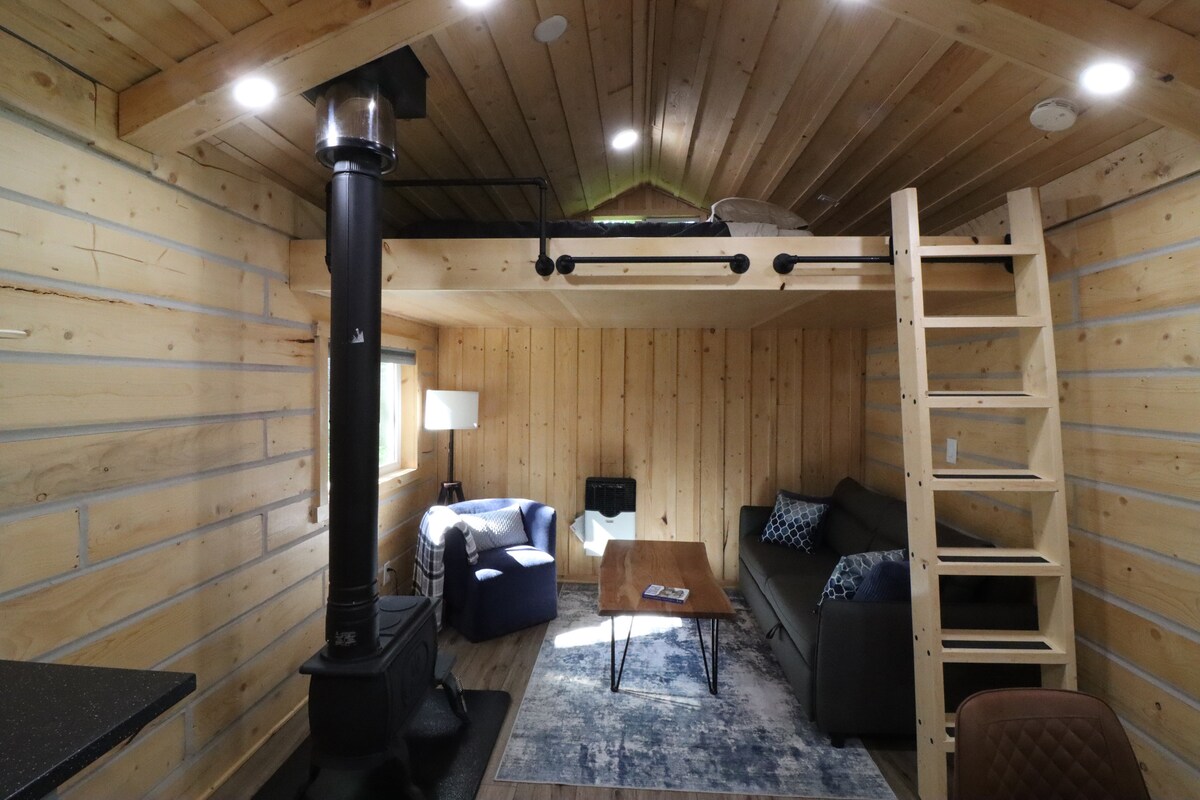 Entra en un tranquilo pueblo invernal de senderos forestales y fuegos crepitantes. Calienta en nuestra sauna (próximamente), pasea por senderos nevados con raquetas de nieve y termina la noche observando las estrellas bajo un cielo despejado, todo sin el largo viaje por la montaña. Cama tamaño queen (capacidad para 2 personas), cama doble en el loft (capacidad para 2 niños o 1 adulto) Características interiores: chimenea de madera Características al aire libre: fogata privada, barbacoa, utensilios de cocina, mesa de picnic, leña proporcionada, ducha al aire libre, baño privado y nuestra nueva sauna. Se admiten perros