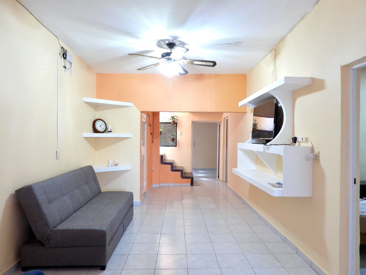 Casa en área tranquila con 2 habitaciones, 2 minisplits, sala con televisión, comedor, 2 ventiladores de techo, cocina equipada, área de lavado, patio, cochera para un automóvil. Cerca de centro comerciales y playas.