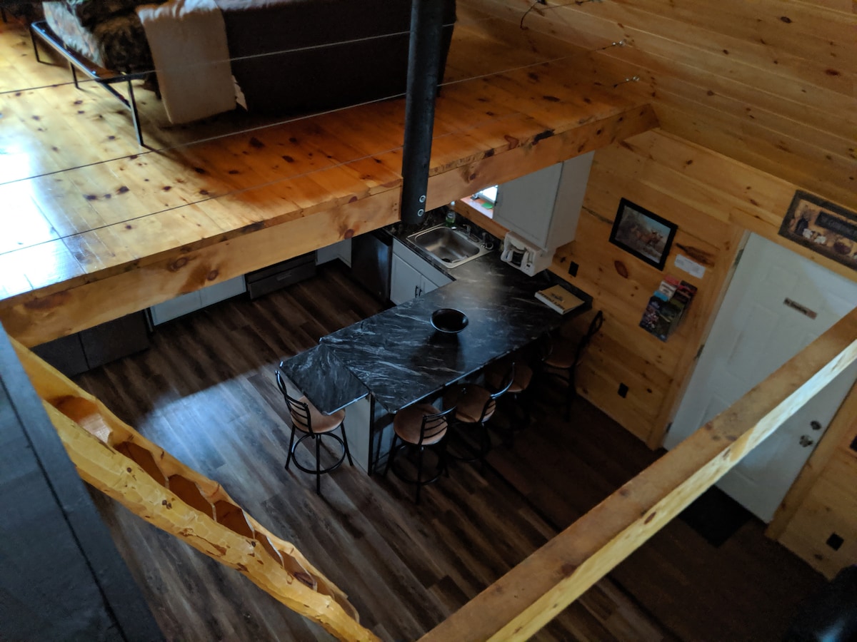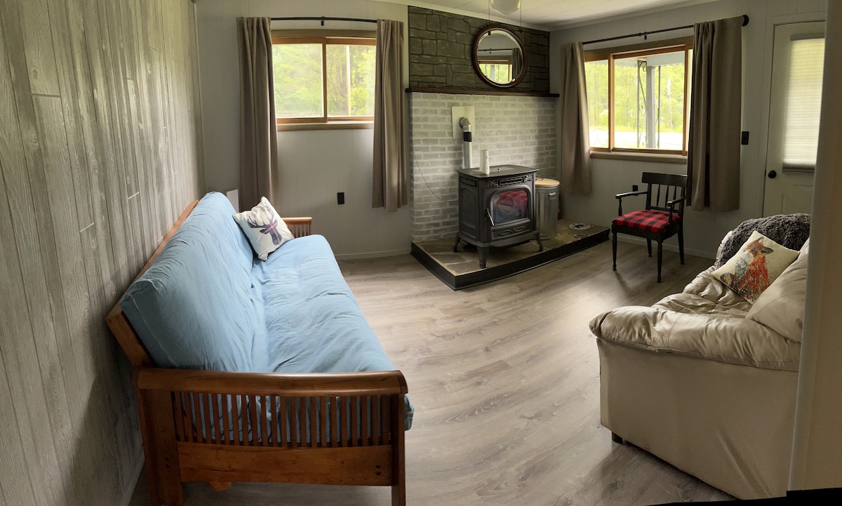 Cabaña moderna en 500 acres privados. Contamos con senderos privados, pesca y senderismo disponibles para todos los huéspedes. Cuenta con 2 dormitorios con 4 camas individuales, cocina completa, WiFi, DirecTV, chimenea de gas, aire acondicionado, sauna y 1 baño completo. Nuestra cabaña también tiene una gran zona de loft con un futón y 4 camas individuales. Tiene capacidad para dormir cómodamente entre seis y ocho huéspedes con aire acondicionado y calefacción. Cocina equipada con elementos básicos de cocina.