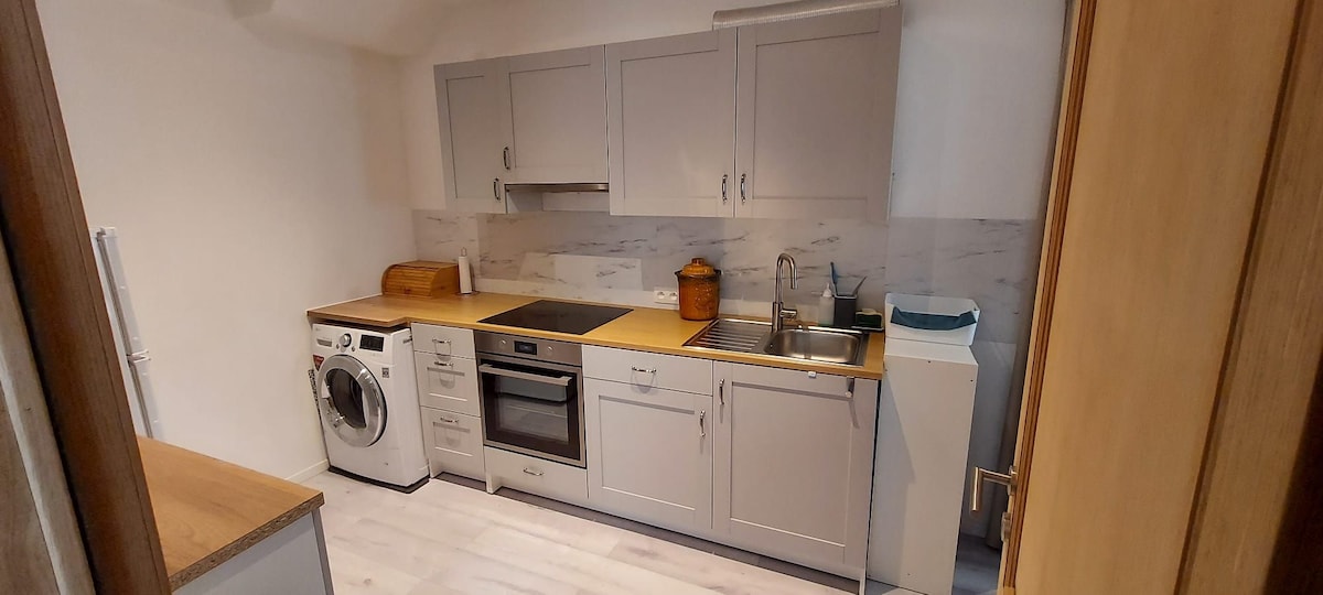 Estudio tranquilo y privatizado, en el primer piso de un edificio residencial, a 15 minutos de Bruselas y cerca del ring para explorar Bélgica. Estudio con cama de matrimonio (140x200), zona de estar con sofá cama (140x190), Smart TV, escritorio y cocina americana (microondas, nevera, cafetera). Baño con ducha y WC separado + lavadora. Se proporcionan sábanas y toallas. Aparcamiento gratuito en la calle y garaje privado seguro disponible en el edificio. Ideal para una estadía tranquila.
