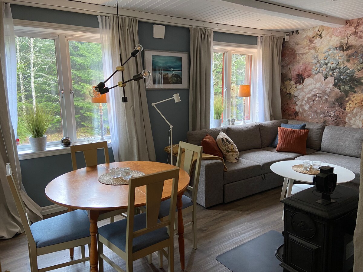 ¡Vive en una acogedora cabaña de madera en medio del bosque, a 100 metros del lago! Hermosos alrededores, muchos lugares para caminar y relajarse en la naturaleza, tanto en verano como en invierno. El parque Vallåsen, que ofrece uno de los mejores parques de bicicletas de Suecia, así como pistas de esquí y esquí de fondo, está a solo 25 minutos de nuestra cabaña. La cabaña tiene una superficie de unos 100 metros cuadrados. A su disposición hay una cocina totalmente equipada, un baño, un salón con chimenea, dos dormitorios y una acogedora sauna privada.