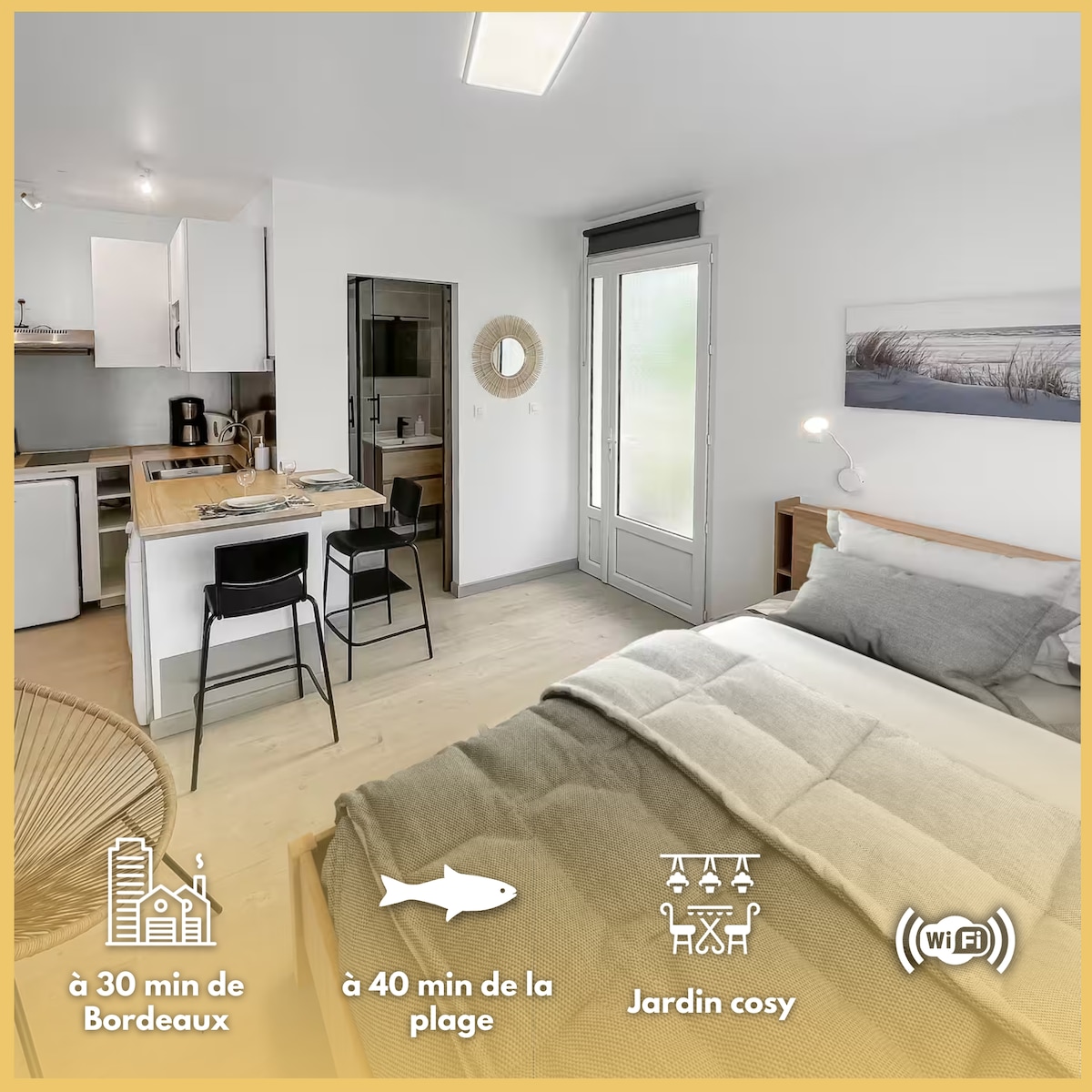 Bonito estudio (25 m²) en la planta baja independiente de la casa de los propietarios. Con una ubicación ideal cerca de Burdeos, a 35 minutos de la bahía de Arcachon y a 10 minutos de los grandes viñedos de Burdeos (Haut Brion, Pape Clément). En una zona residencial muy tranquila, le damos la bienvenida a este alojamiento bien equipado con todas las comodidades para una estancia agradable. El estudio dispone de una zona de jardín privada con muebles de jardín y barbacoa, así como de una plaza de aparcamiento gratuita justo enfrente.