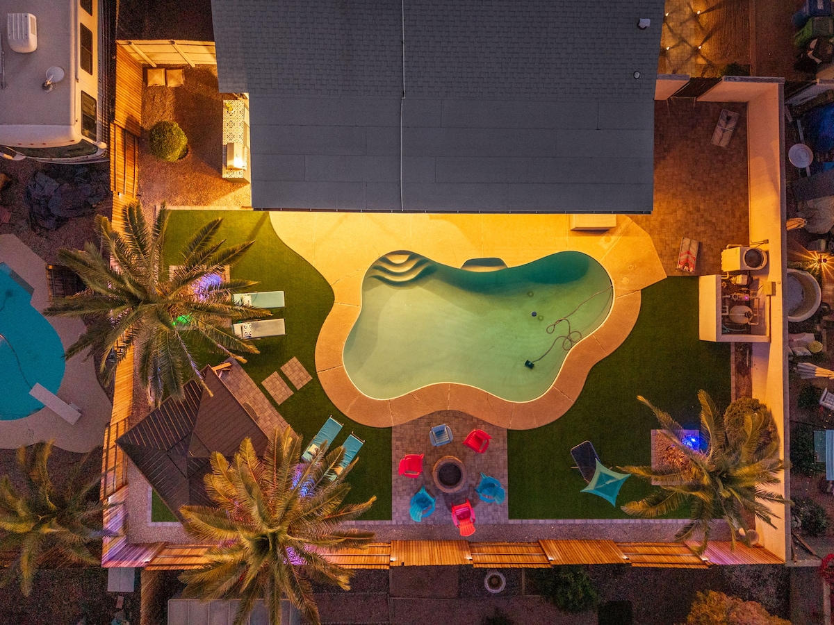 Piscina y mesa de billar en una casa familiar que admite mascotas