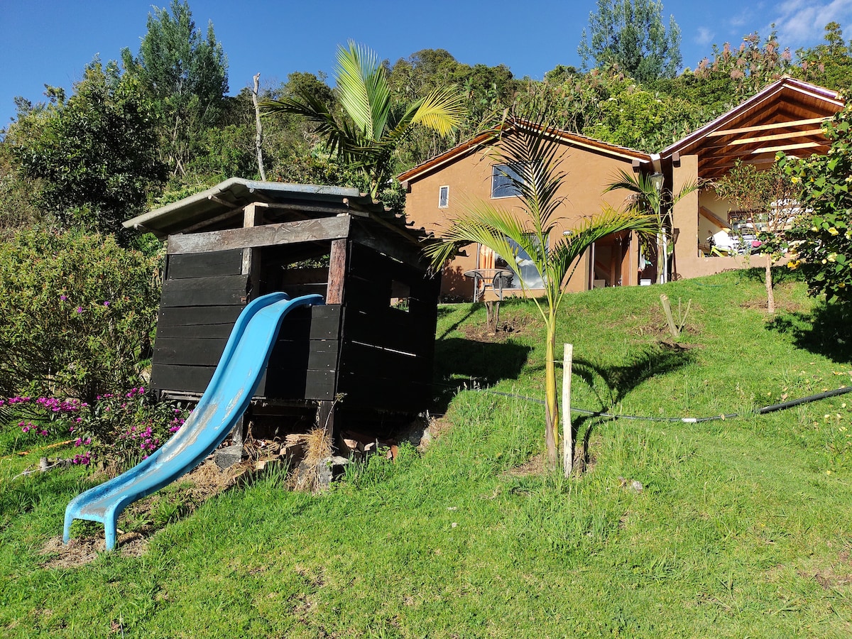 Hermosa casa en medio del bosque andino y subparamo, rodeada de naturaleza para escapar de la rutina y disfrutar de un ambiente tranquilo y relajado. Deléitate con el aire fresco de la mañana, deslúmbrate con los atardeceres y en la noche disfruta de una copa de vino frente a la chimenea. Puedes realizar caminatas de varios niveles de dificultad y distancia, montar bicicleta, leer y meditar. Preparar los alimentos que más te gusten y armar tu propio picnic. Ven y descubre este paraíso!