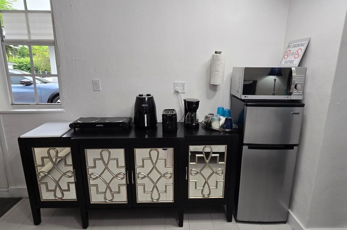 This cute and cozy studio is in the heart of Miami! It features a private entrance, a luxury queen-size mattress and bedding, a reclining sofa, a workspace with a desk and chair, a full bathroom with supplies, and a dining table for two. Includes parking, Wi-Fi, smart TV, microwave, small fridge, Air fryer, Coffee Maker W/ coffee and sugar to give you a special touch to your mornings. The Studio is attached to the Main House. Enjoy easy access to everything from this centrally located Studio.