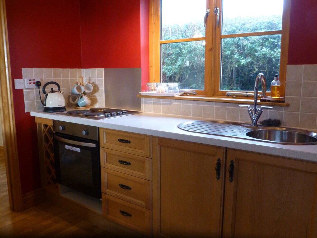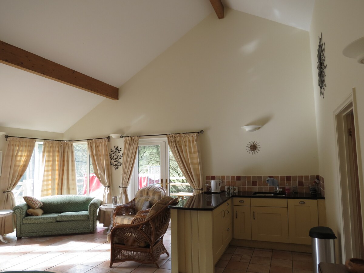 Las vacaciones autónomas engañosamente espaciosas se encuentran en 4,5 acres de terreno en Friars Farm con arroyo adyacente. La propiedad tiene techos abovedados, cama súper tamaño king, con habitación húmeda en suite y otro guardarropa. La gran sala de estar/ comedor también tiene sofá cama para huéspedes adicionales. Calefacción por suelo radiante y quemador de leña, TV con caja de satélite gratuita, cocina bien equipada con muchas instalaciones. Jardín privado bien vallado con jacuzzi y muebles de jardín para tu uso exclusivo.