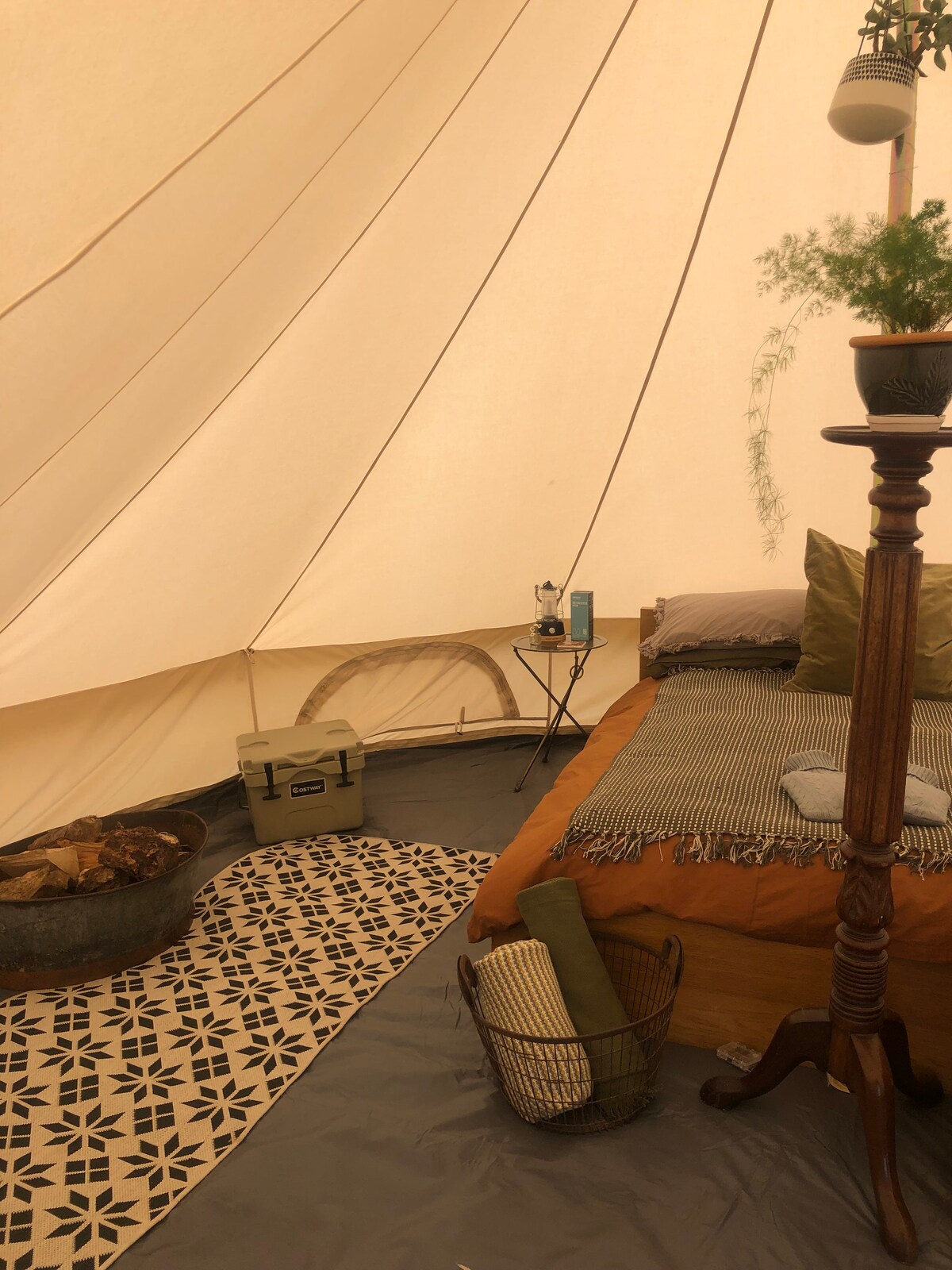 Nestled on our land in the rolling hills of Devon, our spacious Domes offer a peaceful escape for those want to be in nature without sacrificing too much comfort. Enjoy camping with added luxuries, soft low-level lighting, running water, a gas hob, and a full bathroom inside the tent. Set within a seven-acre meadow, our two Domes are perfectly positioned to offer privacy and seclusion, while also being ideal for couples/families wishing to holiday together.