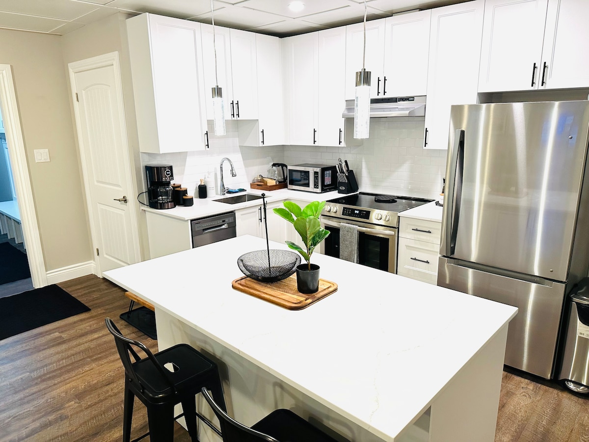 Esta acogedora suite cuenta con 1 dormitorio más un sofá cama opcional (tiene capacidad para 4 personas), con una cocina y sala de estar de concepto abierto bellamente renovadas. Las grandes ventanas y los techos de 9 pies proporcionan abundante luz natural. Disfruta de acceso a un gimnasio, lavandería, chimenea eléctrica y cocina totalmente equipada, todo lo necesario para estancias cortas o de media duración. Esta unidad inferior es ideal para visitar amigos y familiares o para viajes de trabajo tranquilos. Te sentirás como en casa con un diseño privado y autónomo.