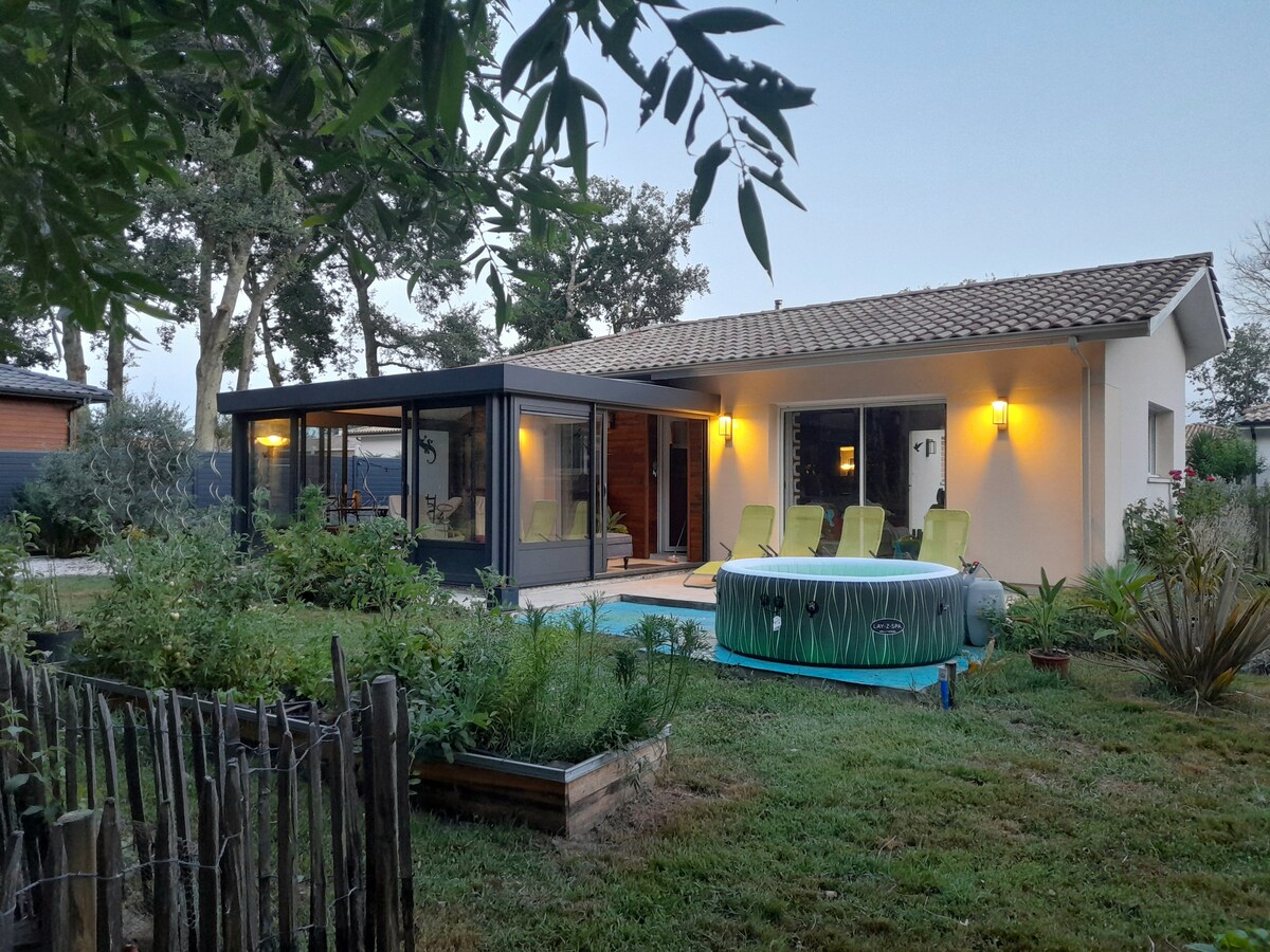 Relájese en este alojamiento tranquilo y elegante. Casa totalmente independiente que consta de: Salón con cocina, 2 dormitorios con camas de 160, 1 baño con inodoro. Cuna disponible si es necesario. Podrá disfrutar de una bonita terraza con zona de comedor y barbacoa, sin vecinos. Estamos idealmente situados, entre Burdeos, la cuenca de Arcachon y Biscarrosse, a unos 30 minutos de cada una de estas ciudades Fácil acceso a las tiendas, pero es necesario disponer de vehículo. Acceso rápido a la A63.
