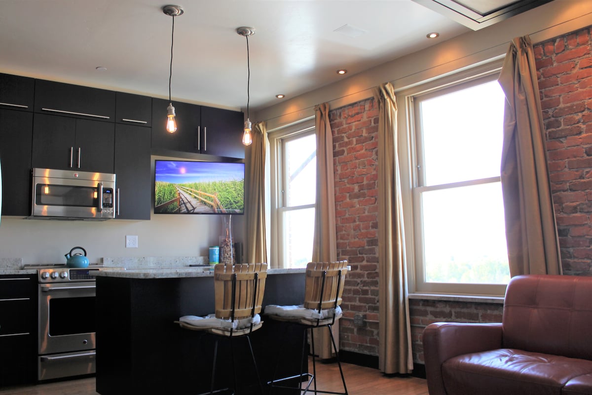 Este distintivo estudio se encuentra en el corazón del centro de Missoula, en el histórico edificio Wilma de ocho pisos. Las ventanas de gran tamaño que se extienden a través de la pared sur te ofrecen las vistas más impresionantes de Caras Park, por lo que si te apetece participar en los diversos eventos/festividades estás a solo unos pasos de distancia, o tal vez prefieras observar desde una vista de pájaro en la comodidad de tu estudio de lujo... ¡la elección es tuya!