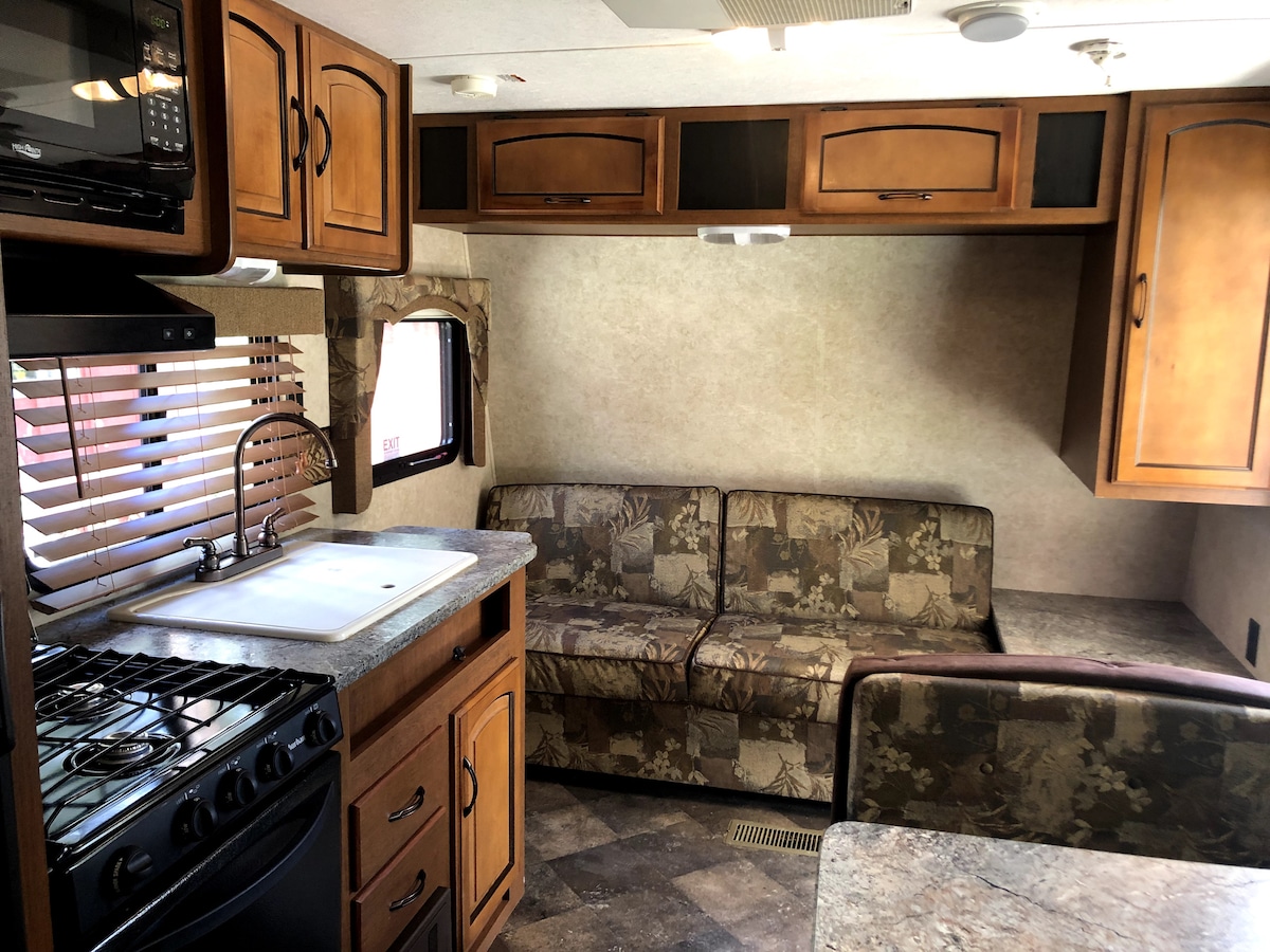 Esta es una hermosa caravana con toldo, literas, una habitación privada con cama tamaño queen, cocina, baño con ducha, ducha al aire libre, comedor, sofá, pantalla plana, aire acondicionado y calefacción. Está justo al lado de un bonito arroyo estacional con un toldo y mesa y sillas y también tenemos preciosas rutas de senderismo. Se admiten perros, no se admiten gatos. Ten en cuenta que estamos a lo largo de una carretera muy transitada y que hay ruido de la carretera y vías de tren cerca, pero también estamos muy cerca de los servicios.