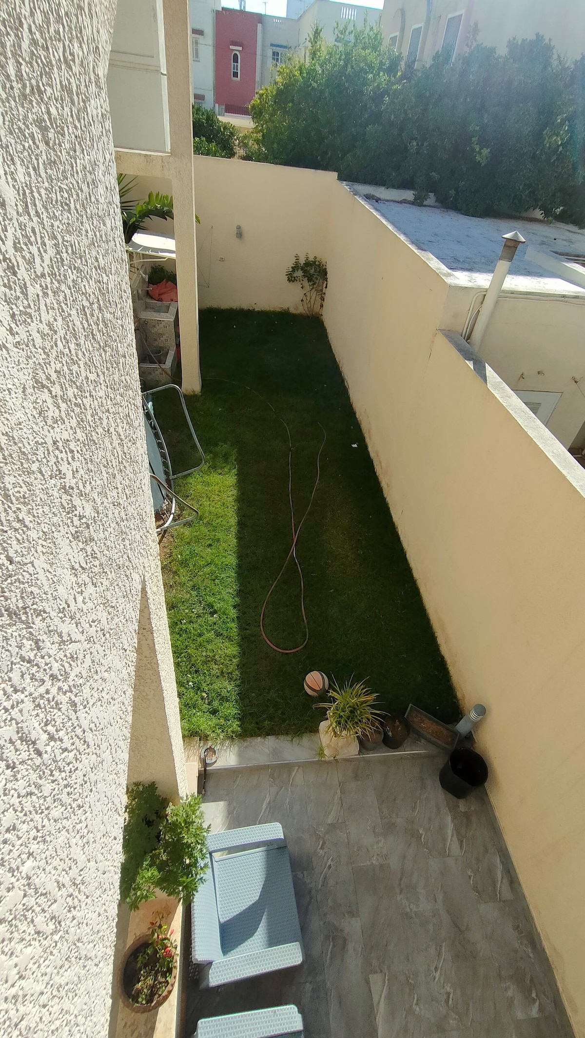 Este apartamento de villa de primer piso, nuevo y elegante, tiene capacidad para 7 personas y ofrece comodidad moderna en un barrio tranquilo. Cuenta con 2 dormitorios con camas tamaño queen (incluida una suite principal con un patio privado con vistas a las palmeras), 1 dormitorio con dos camas individuales y un sofá en la sala de estar. 2 baños, sala de estar con TV inteligente de 65” y futbolín, cocina totalmente equipada, calefacción y aire acondicionado. Camina al Museo Bardo y Stade Tunisien, a 15 minutos del centro de la ciudad y el aeropuerto. Estacionamiento gratuito en la calle.