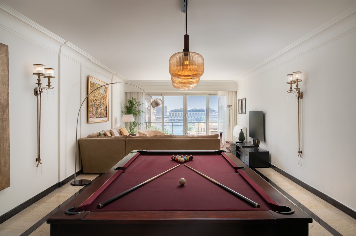 Disfrute de una vista privilegiada del Nilo y de la luz matutina sobre el río. El Nilo forma parte de su día: un café junto a la ventana, un paseo vespertino por el paseo marítimo y un regreso tranquilo a casa. En el interior: Wi-Fi de alta velocidad, un televisor inteligente de 55 pulgadas y una cocina totalmente equipada.Por la noche, acomódese en sábanas de algodón egipcio de calidad hotelera; las ventanas con aislamiento acústico, las persianas eléctricas, las cortinas opacas y el aire acondicionado constante mantienen la habitación fresca y oscura para un sueño profundo.
