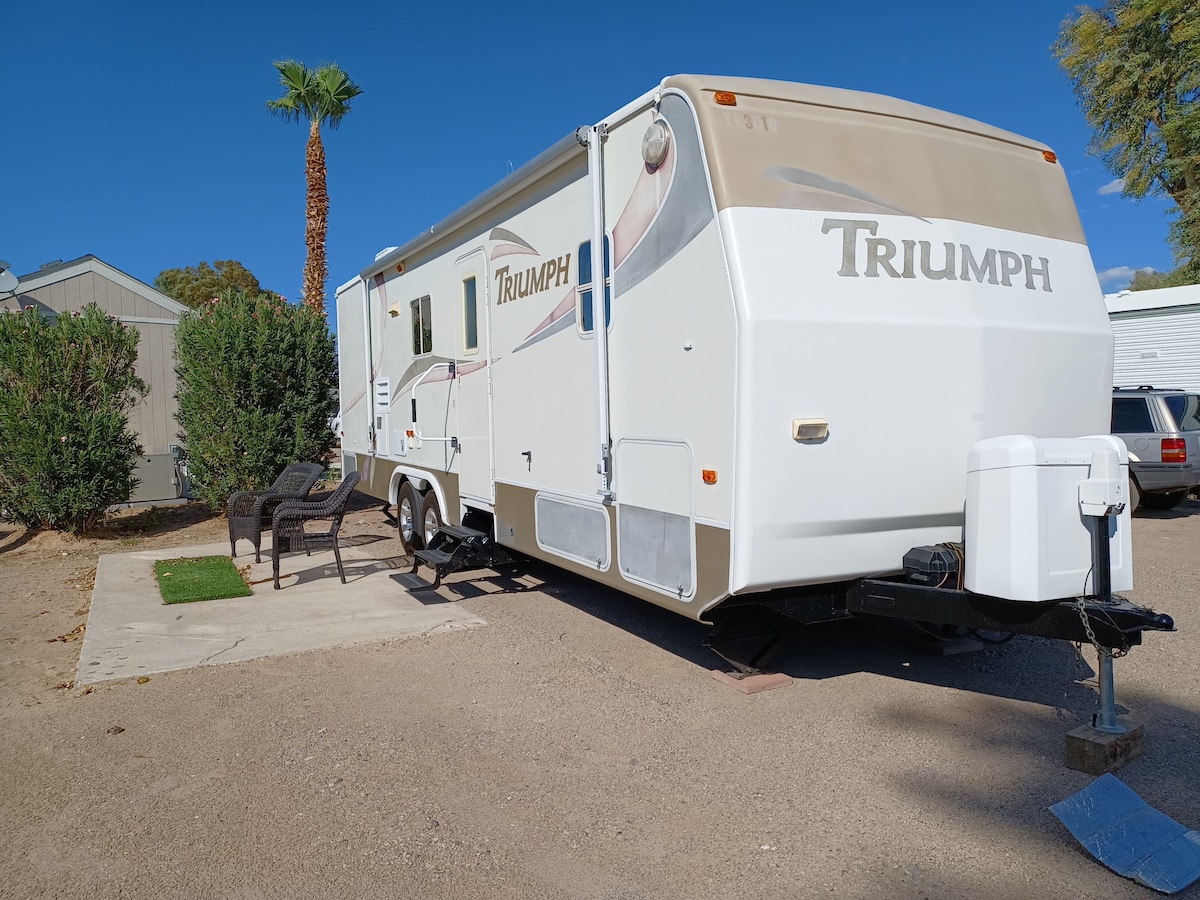 Experimenta el entorno rural de nuestro Country Chateau RV en el desierto de Arizona escénico en este acogedor vehículo recreativo de 1 dormitorio. La cama tamaño queen garantiza una noche de sueño tranquilo para los huéspedes en un dormitorio privado. Con una sala de estar con una mesa convertida en cama y un sofá cama. Hay un montón de espacio impresionante para relajarse. La calefacción y el aire acondicionado te mantienen cómodo durante todo el año, mientras que el baño con ducha proporciona todos los elementos esenciales. Es fácil ver por qué podrás relajarte en nuestra casa rodante.