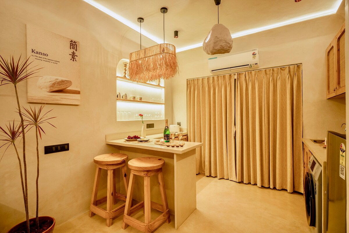 Kanso by Earthen Window es un tranquilo 1BHK en Siolim, formado alrededor de la tierra, la luz y la privacidad. Diseñados para mañanas lentas y noches sin prisas, los interiores están hechos con paredes encaladas, suaves pisos de microhormigón y objetos cuidadosamente elegidos que le dan un encanto de villa. El dormitorio se abre a una TERRAZA PRIVADA CON JARDÍN y a una bañera de hidromasaje aislada de microconcreto con JACUZZI, ambas con vistas ininterrumpidas al bosque verde. Los servicios compartidos incluyen una piscina, sala de vapor, gimnasio y seguridad 24×7.