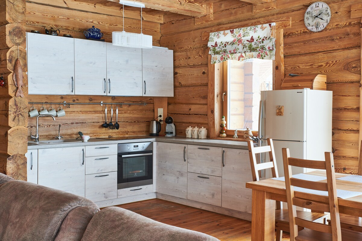 Esta es una de nuestras tres cabañas, ubicadas en una ubicación única, rodeada de pinos forestales de Labanoras centenarios, y en solo 3 minutos a pie por senderos pintorescos se puede llegar a la costa del famoso lago Beaver, donde las actividades acuáticas te esperan en verano, y en la temporada de frío, paseos por los alrededores. Vista del bosque a través de enormes ventanas panorámicas, sonidos de la naturaleza alrededor, disfrutando lentamente del café en la terraza de la azotea... Nuestras cabañas atraerán a las personas que buscan un descanso de calidad y un entorno elegante.