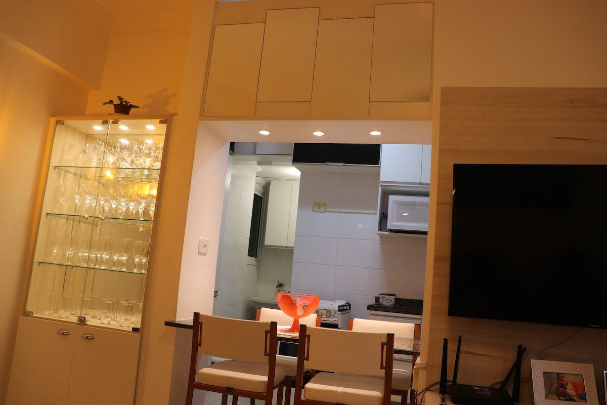 Este departamento de 55 m² es ideal para parejas y ejecutivos en viajes de negocios. Tiene todo lo que esperarías de un departamento: practicidad y tecnología. Para aquellos que vienen a pasar la víspera de Año Nuevo en Santos, pueden disfrutar de las festividades sin siquiera salir del edificio. Desde el área de la piscina, puedes disfrutar de la vista al mar, los fuegos artificiales y el ambiente festivo de la ciudad sin tener que lidiar con el tráfico, las multitudes o un viaje agotador después de los fuegos artificiales.