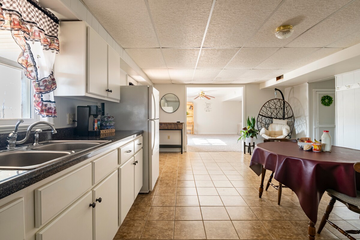 «Descansa un rato». Disfruta de nuestra suite privada para huéspedes que cuenta con una gran sala de estar principal donde también se encuentran la cocina pequeña y el comedor, un dormitorio separado y un baño privado. Esta suite se encuentra en el nivel inferior de nuestro rancho elevado y requiere la capacidad de usar seis escalones. Accede al alojamiento directamente mediante la entrada principal privada con teclado. Plaza de aparcamiento en la entrada con pasarela iluminada pavimentada hasta la entrada.